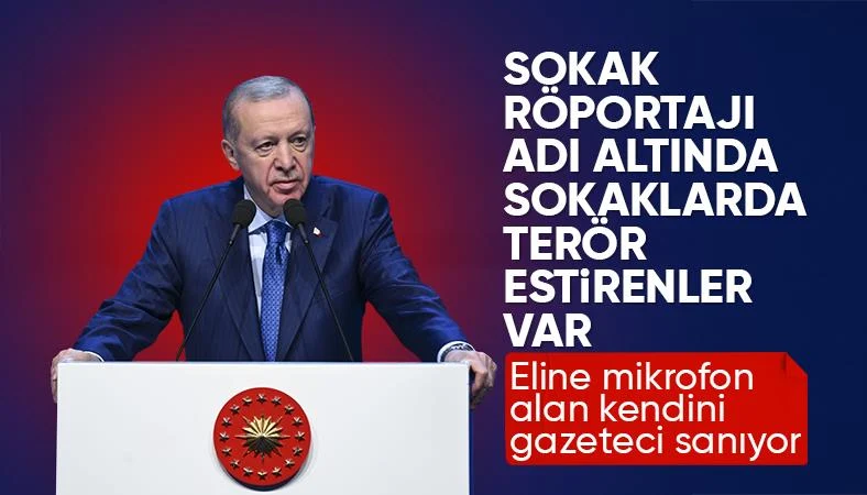 "Her steteskop takana doktor demiyorsak eline mikrofon alıp sokağa çıkan herkes gazeteci değildir, basın mensubu değildir." diyen Cumhurbaşkanı Erdoğan, "Özellikle yabancı güçlerin operasyon aygıtı olarak toplum mühendisliğine heveslenen medyaya ne saygı duyarız ne müsamaha gösteririz." şeklinde konuştu.