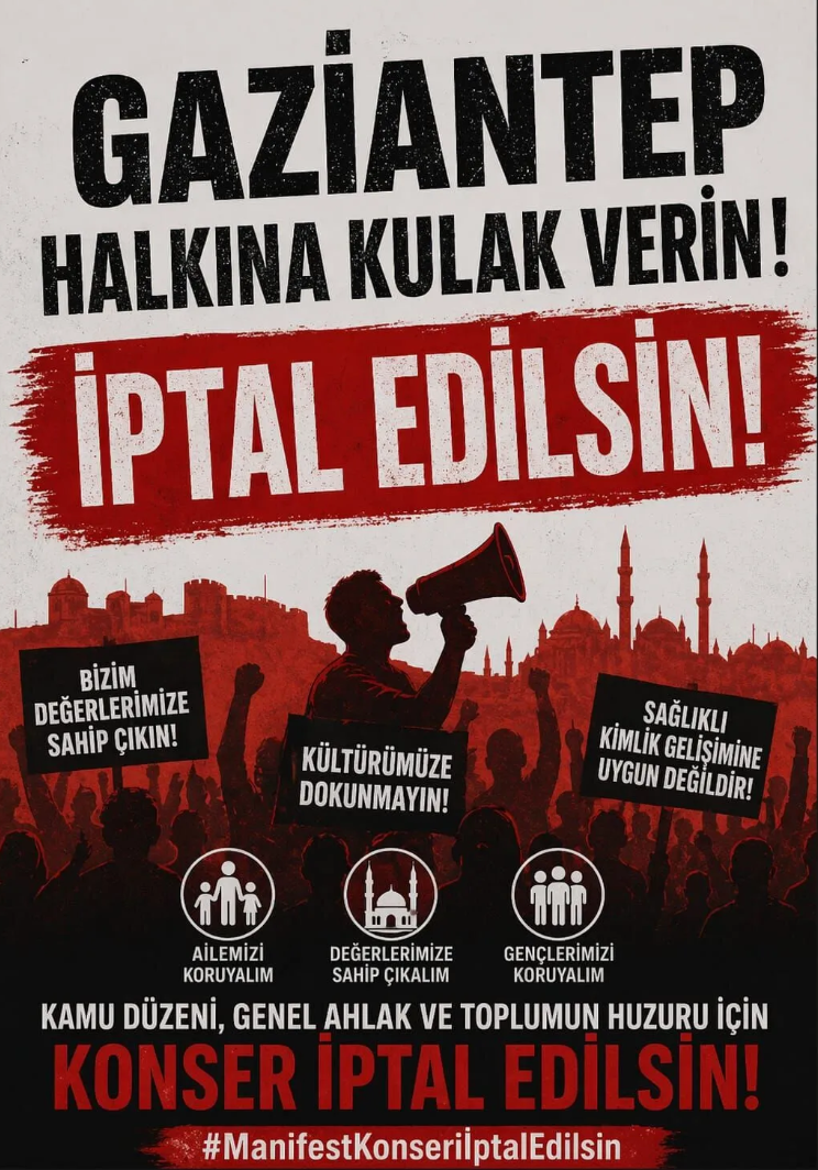 Gaziantep’te 9 Mayıs’ta düzenlenmesi planlanan “Manifest” konseri, kentteki sivil toplum kuruluşları ve vatandaşların sert tepkisiyle karşılaştı. Toplumsal değerlere ve ahlaki yapıya aykırı olduğu gerekçesiyle hedefe konulan organizasyon için "iptal" çağrıları çığ gibi büyüyor.