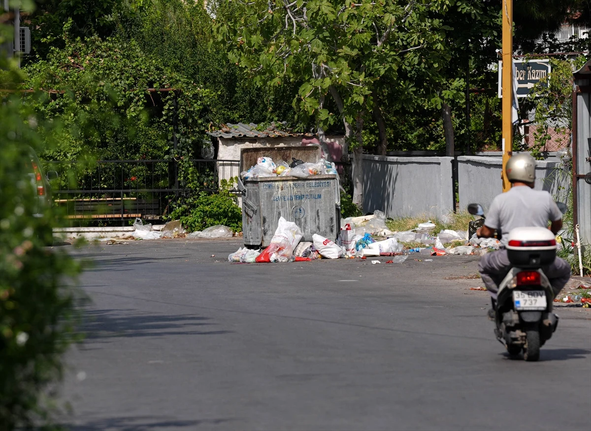 Çöplerin toplanma aralığının uzaması üzerine çöp kutuları doldu, çöpler kutuların etrafına taştı. Çiğli Belediyesi'nin hizmet binası yakınlarında bulunan çöp kutularında da doluluk nedeniyle vatandaşlar atık poşetlerini yerlere bıraktı.
