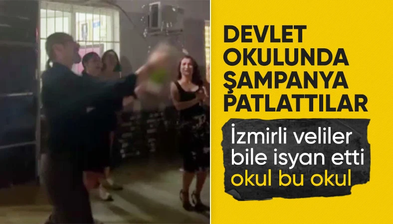 Öğretmenlerin okul bahçesinde müzik eşliğindeki kutlamada Beden Eğitimi öğretmeni olduğu iddia edilen bir kişi şampanya patladı.