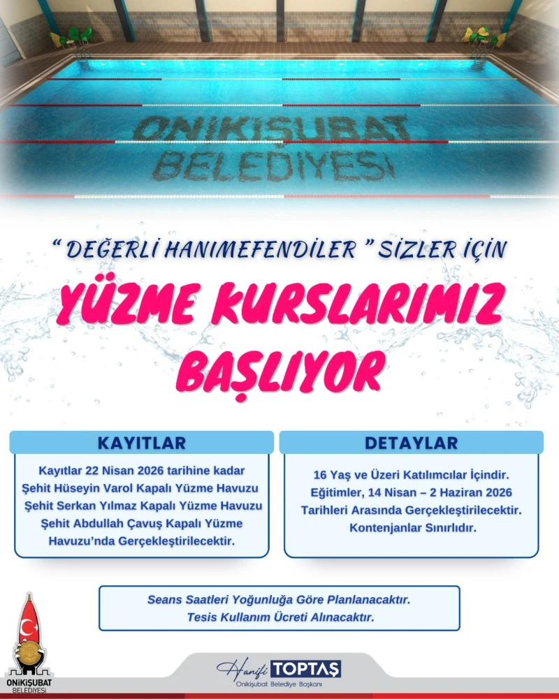 Onikişubat Belediyesi tarafından düzenlenen yüzme kursu programı, 16 yaş ve üzeri kadınlara yönelik olarak planlandı. Katılımcılar, temel yüzme tekniklerinden başlayarak ileri seviyeye kadar eğitim alma fırsatı bulacak. Böylece hem yüzme öğrenmek isteyen hem de kendini geliştirmek isteyen kadınlar için kapsamlı bir program sunuluyor.