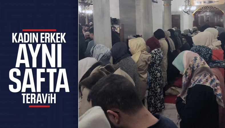 Teravih namazı sırasında erkek ve kadınların yerinin ayrılmasına rağmen yaşanan bu görüntü, tartışmaları da beraberinde getirdi.