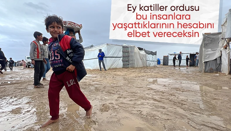Saldırılar nedeniyle evlerini terk ederek Gazze'nin Han Yunus kentine sığınan Filistinliler, bir yandan çocuklarına su ve gıda malzemelerini temin etmeye çalışırken diğer yandan kaldıkları derme çatma çadırlarda soğuk hava şartlarıyla mücadele ediyor.