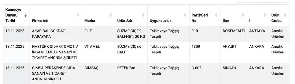 Arıcılık ürünleri ürün grubuna giren gıdalar, "Aynı Değeri Taşımayan Madde Eklenmesi" listesinde yar alıyor. Bal olarak satılıyor ancak balı taklit eden farklı maddelerden oluşuyor. Bu da balda oynama yapıldığını ortaya koydu.