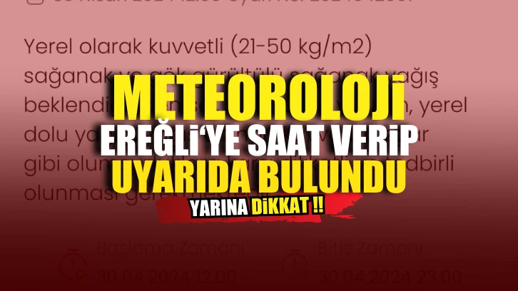 “Yapılan son değerlendirmelere göre; 30 Nisan Salı günü İç Anadolu (Ankara, Konya, Karaman, Niğde, Aksaray, Kırşehir, Kırıkkale, Nevşehir, Çankırı ve Yozgat), Doğu Akdeniz’in iç kesimleri (Adana’nın kuzeyi, Mersin’in iç kesimleri, Antalya’nın doğusunun iç kesimleri) ile Kastamonu çevrelerinde yerel olarak kuvvetli (21-50 kg/m2) sağanak ve gök gürültülü sağanak yağış beklendiğinden sel, su baskını, yıldırım, yerel dolu yağışı, yağış anında kuvvetli rüzgar gibi olumsuzluklara karşı dikkatli ve tedbirli olunması gerekmektedir.”
