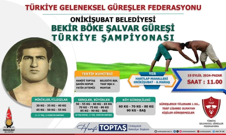 Onikişubat Belediyesi, güreşin kentteki en önemli merkezlerinden biri olan Hartlap Mahallesi’nde Türkiye Geleneksel Güreşler Federasyonu işbirliği ile Bekir Böke Şalvar Güreşi Türkiye Şampiyonası düzenleyecek.